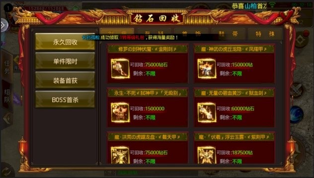 3、打怪爆装,无用装备随时出手,立即兑换成元宝,都是超高价格回收哦。
