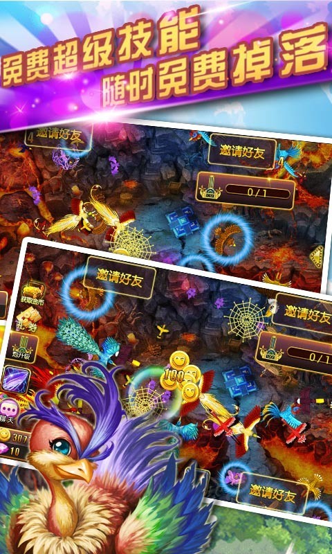 捕鸟达人丰富的场景,包括数个无人居住的神秘岛屿,巨大的森林火山和红色的熔岩的场景,构成了整个捕鸟游戏的风格,华丽的武器可以射出各种华丽的子弹和鸟网,每次射击都有不同的感觉,华丽的技能系统免费获取。