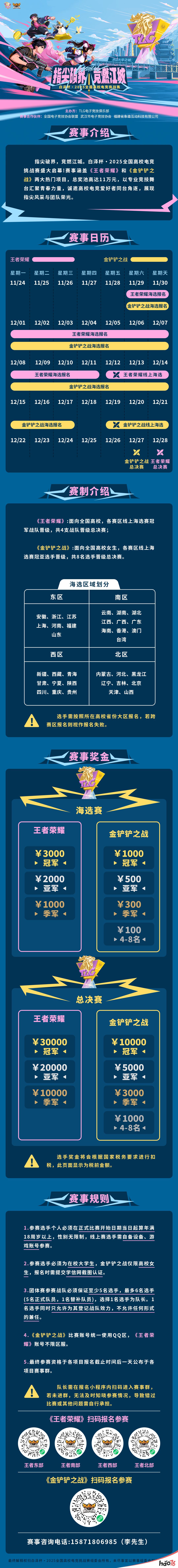 此刻,我们面向全国高校发出集结令——召唤每一个心怀电竞梦的你,一起上场,让操作替你说话,为自己的青春而战!让江城的赛场,见证属于你们的荣光!本次赛事冠军选手可获得签约TLG电竞俱乐部机会哦。